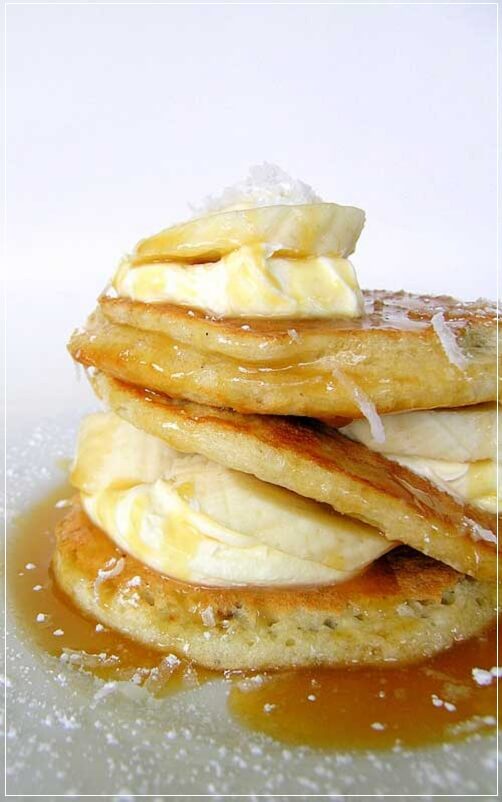 - Slice remaining bananas. Arrange the pancakes in stacks on serving plates, alternating with banana slices and creme fraiche. Drizzle with caramel sauce, then dust with icing sugar and sprinkle with coconut.